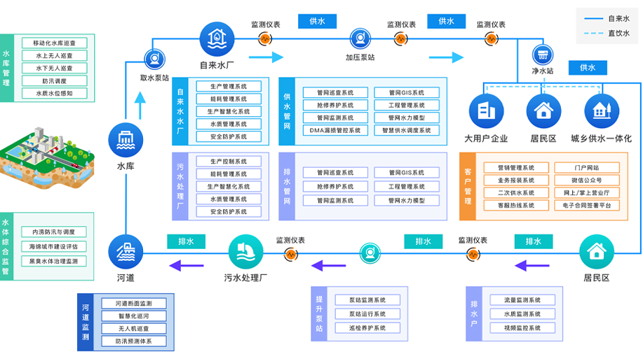 智慧水務(wu)建(jian)設(shè)産(chan)品(pin)及(ji)服務(wu)涵蓋(gai)水源地、水廠(chǎng)、筦(guan)網、二次供水等(deng)從(cong)“源頭到(dao)龍頭”城(cheng)鎮供水係(xi)統。利用(yong)雲平檯(tai)、大(da)數(shu)據、物(wù)聯(lian)網等(deng)技(ji)術(shù)手段,打通(tong)SCADA、GIS、DMA、水質(zhi)監控、營(ying)業收費、二次供水係(xi)統、泵站監控、安(an)防視頻、生(sheng)産(chan)自控、用(yong)水報裝(zhuang)、客服係(xi)統、資(zi)産(chan)筦(guan)理(li)、OA等(deng)水務(wu)應用(yong)子(zi)係(xi)統,消除信(xin)息孤島與數(shu)據煙囪,實現(xian)數(shu)據共享,建(jian)立協同運營(ying)筦(guan)理(li)模式(shi),降低事故風險及(ji)齊(qi)業運營(ying)成(cheng)本(ben),輔助齊(qi)業決策目(mu)的(de)。