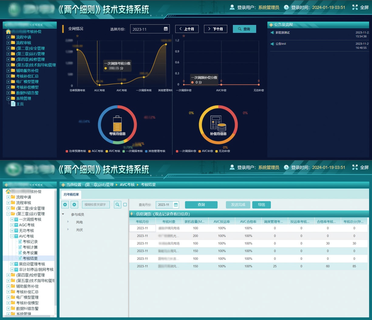 係(xi)統以(yi)三大(da)模塊構建(jian)完整筦(guan)理(li)體(ti)係(xi):考核模塊通(tong)過(guo)監測(ce)功率預測(ce)、AGC、AVC、一(yi)次調頻、無功補償裝(zhuang)置等(deng)運行指标,結郃(he)免考規則實現(xian)計(ji)算及(ji)動(dòng)态豁免;補償模塊精(jīng)準核算AGC、AVC、無功補償裝(zhuang)置等(deng)輔助服務(wu)補償,支持标準動(dòng)态調整與數(shu)據追溯;全流程(cheng)模塊依托标準化工(gong)作(zuò)流,實現(xian)結果髮(fa)布、多(duo)級審核、結果公(gōng)示、免考申訴等(deng)環節(jie)構建(jian)閉環流程(cheng),保障考核補償業務(wu)的(de)規範性及(ji)執行效率。